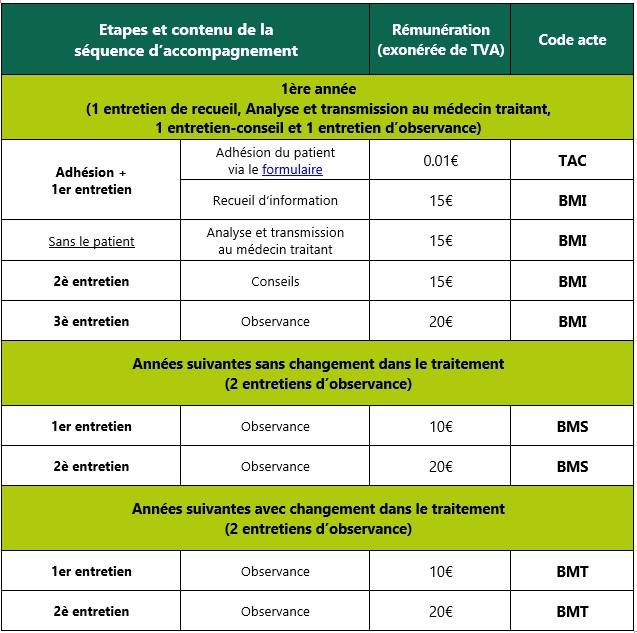 • Au moment de l’adhésion du patient (démarrage de l’accompagnement) et de la réalisation de l’entretien de recueil, le pharmacien facture un acte TAC 0.01€ + acte BMI à 15€ ;